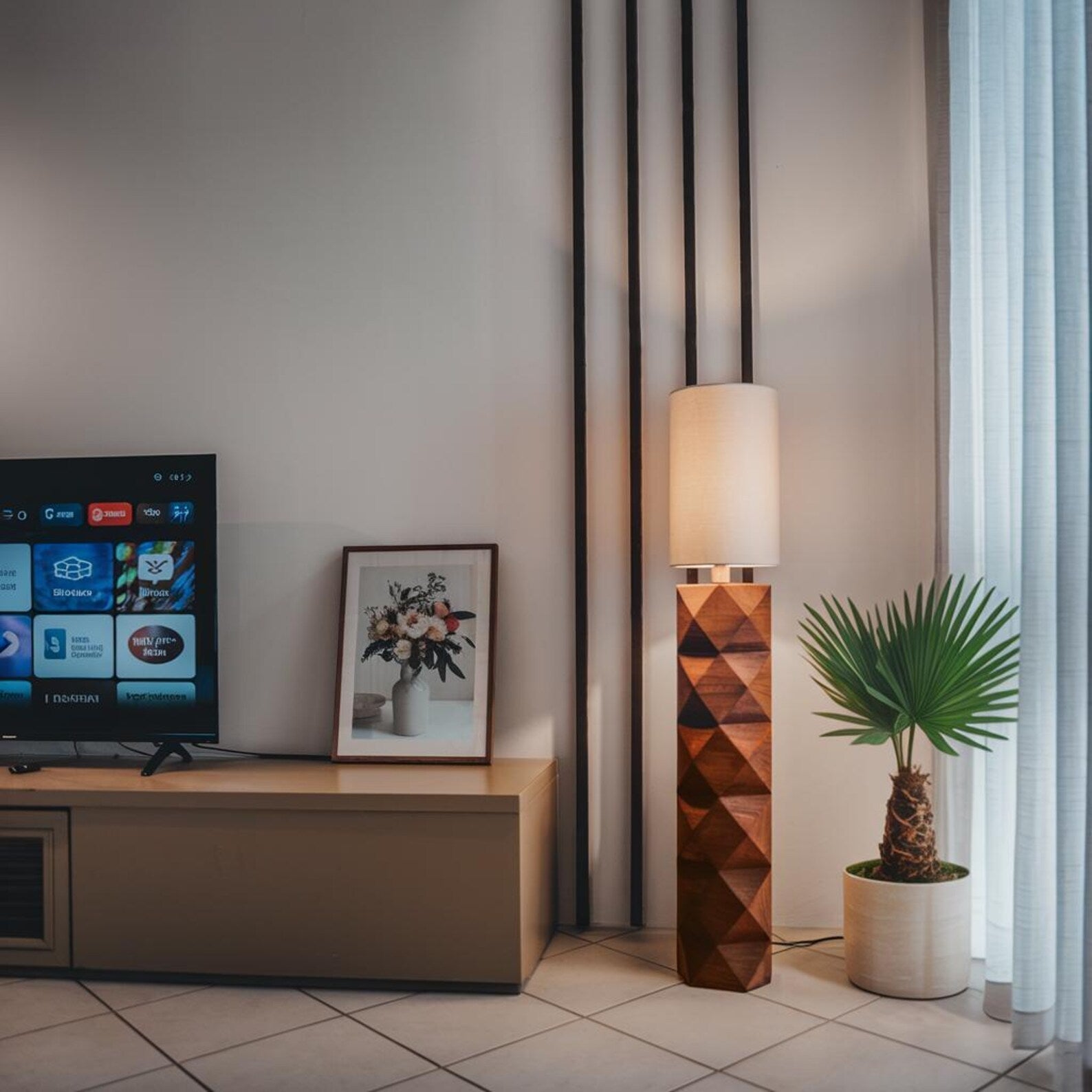 This floor lamp features a geometric patterned base crafted with attention to form and proportion, supporting a cylindrical fabric shade that gently diffuses ambient light. The interplay between bold shape and soft glow creates a striking silhouette that complements contemporary living spaces. Whether paired or placed individually, they offer visual interest without overwhelming the room.