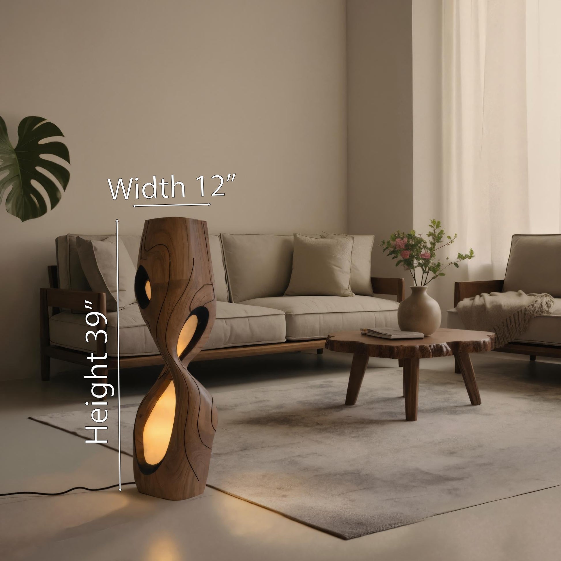 This sculptural floor lamp is crafted with a carved wooden base featuring dynamic cutouts that cast warm, ambient light. Its flowing silhouette creates a sense of movement, while the integrated lighting brings a soothing glow to any setting. Both decorative and functional, it serves as a statement piece in living rooms, bedrooms, or creative spaces.
