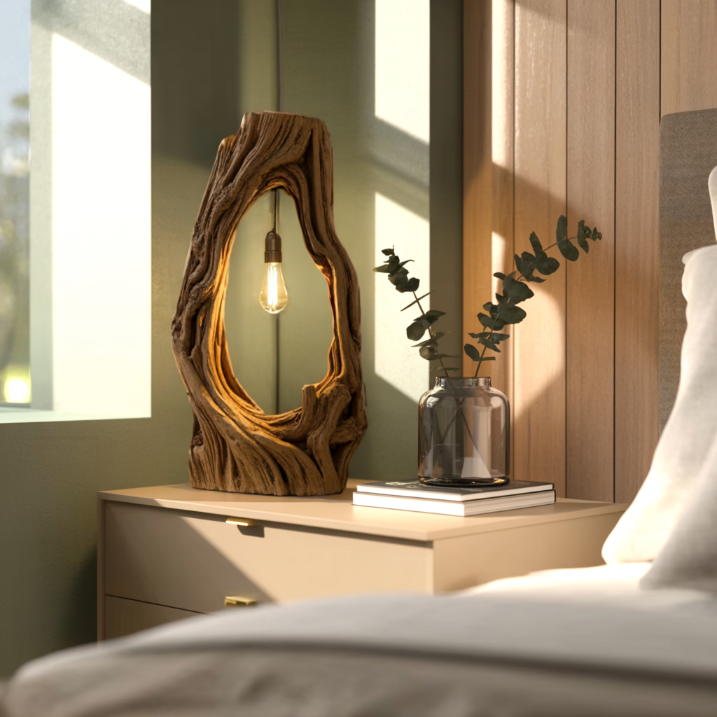 This freestanding table lamp features a robust, sculptural base inspired by weathered timber, with genuine wood grain and irregular contours that evoke the charm of reclaimed wood. An exposed Edison‑style bulb hangs gracefully within the natural frame, casting a warm, inviting glow and serving as a sculptural focal point.