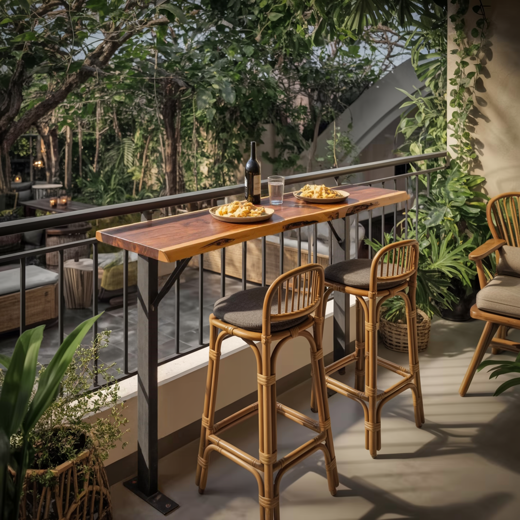 This balcony bar table features a solid wood live edge top that highlights the unique grain and contours of the material. Supported by a sturdy metal rail-mount frame, it offers a secure and streamlined setup that maximizes floor space. The long, narrow profile is ideal for compact balconies, patios, or apartment decks.