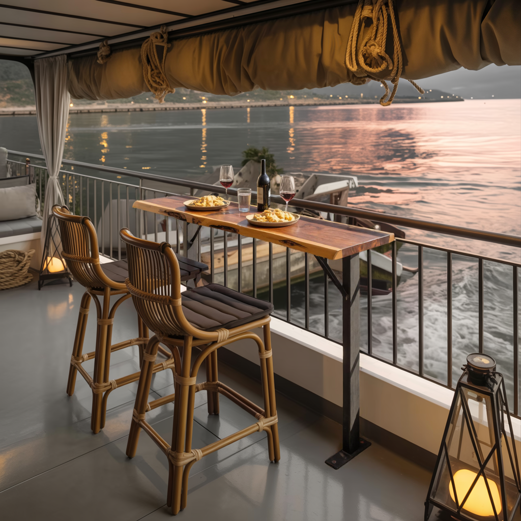 Make the Most of Your Outdoor Space with the Rustic Live Edge Balcony Bar Table For Rail Mount Patio Or Apartment Deck, a space-saving design that blends natural beauty with functional dining. Perfect for enjoying meals, drinks, or morning coffee while taking in the view.